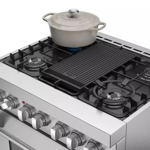 - Queimadores de alta performance: Equipado com cinco queimadores da marca Sabaf/Defendi, incluindo um long burner que pode ser utilizado com uma chapa bistequeira que acompanha o equipamento. Isso garante maior potência no cozimento e controle preciso da potência do queimador.