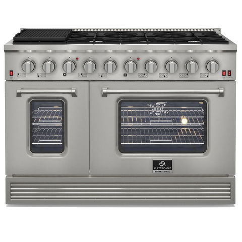 Fogão Professional Inox 48" Elettromec Gás/Gás 127V - 8 Queimadores Dual Flame, Duplo Forno 156L, Trempes Ferro Fundido, Grill a Gás, Acendimento Superautomático
